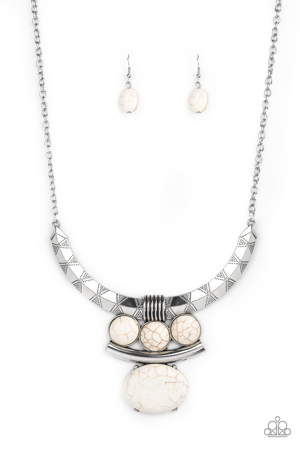 Oversized white stone accents alternate with mismatched silver frames, coalescing into a dramatic tribal inspired pendant below the collar. Features an adjustable clasp closure.