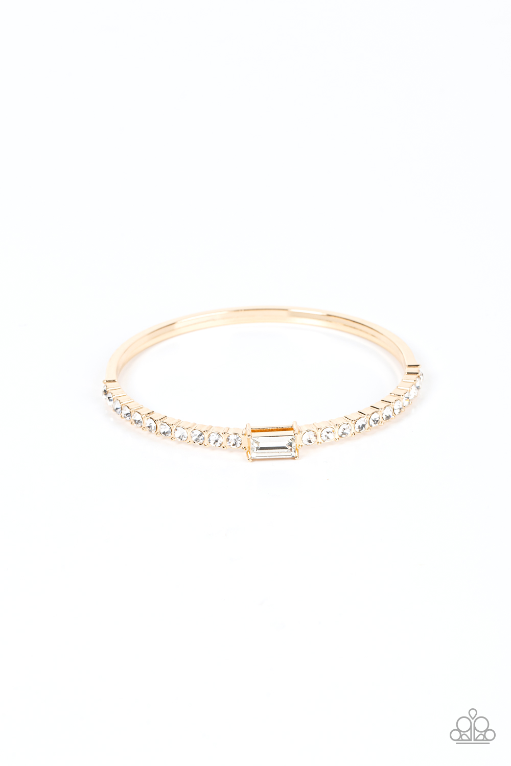 An emerald cut white rhinestone sparkles between a row of glassy white rhinestones across the front of a stunning gold bangle, resulting in a stackable and sparkly centerpiece.