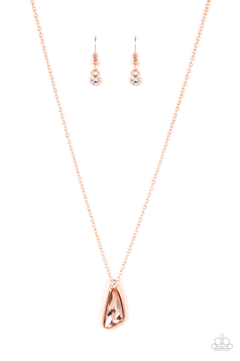 An asymmetrical coppery gem is pressed into a shiny copper frame dusted in glassy white rhinestones, resulting in a refined pendant at the bottom of a dainty shiny copper chain. Features an adjustable clasp closure.