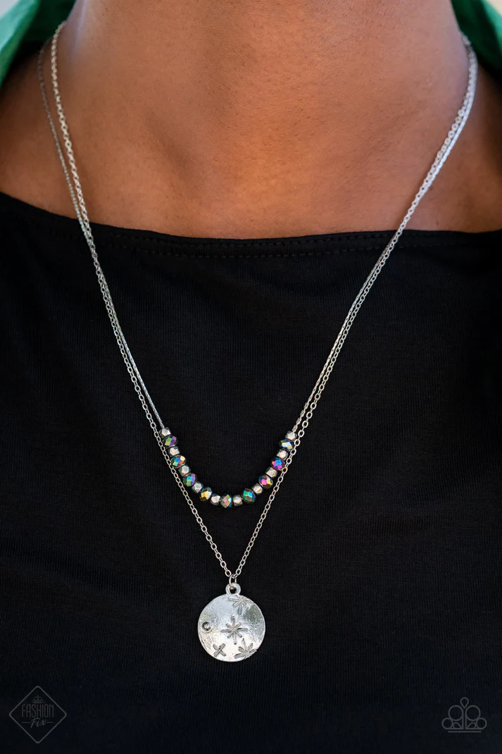 Dotted in a single silver stud, a star-stamped silver disc glistens at the bottom of a classic silver chain. Infused with faceted silver beads, a stellar collection of oil spill crystal-like beads glides along a flat silver chain, resulting in out-of-this-world layers below the collar. Features an adjustable clasp closure.