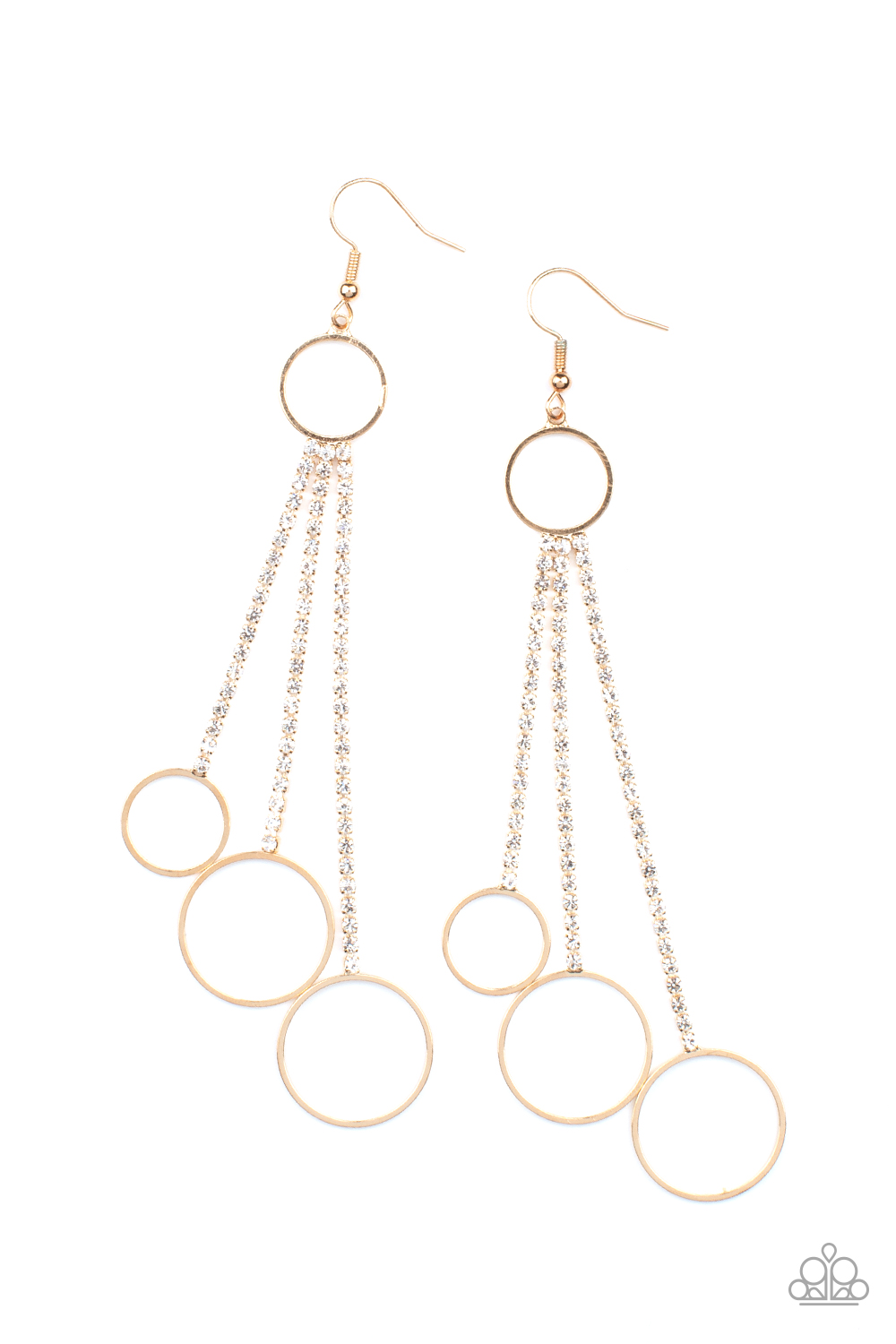 Dainty gold hoops swing from the bottom of glittery strands of glassy white rhinestones that attach to the bottom of a dainty gold ring, creating a tantalizing tassel. Earring attaches to a standard fishhook fitting.