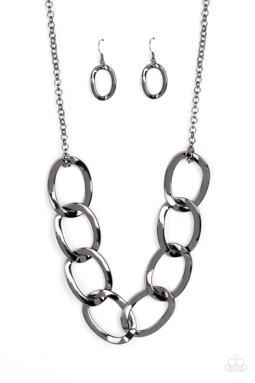 Attached to a classic gunmetal chain, an oversized collection of warped oval links boldly interlocks below the collar for an intense industrial look. Features an adjustable clasp closure.