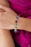 Featuring various shapes and shades, a collection of teardrop, round, heart, and square-cut gems in matching silver frames coalesce around the neckline for an abstract display of color and charm. Features an adjustable clasp closure.