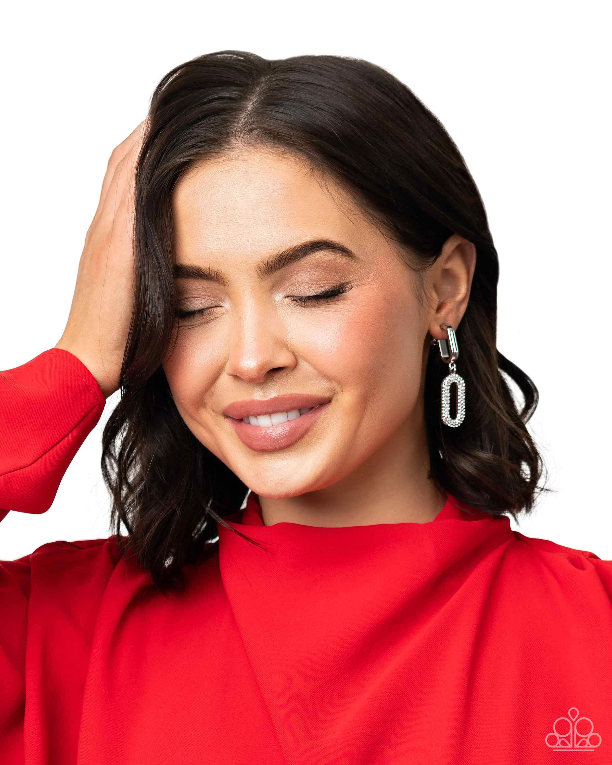 Two oversized links, one a sleek silver, the other embellished with a blinding collection of white rhinestones, coalesces into a luxurious lure as it sways from the ear. Earring attaches to a standard clip-on fitting.