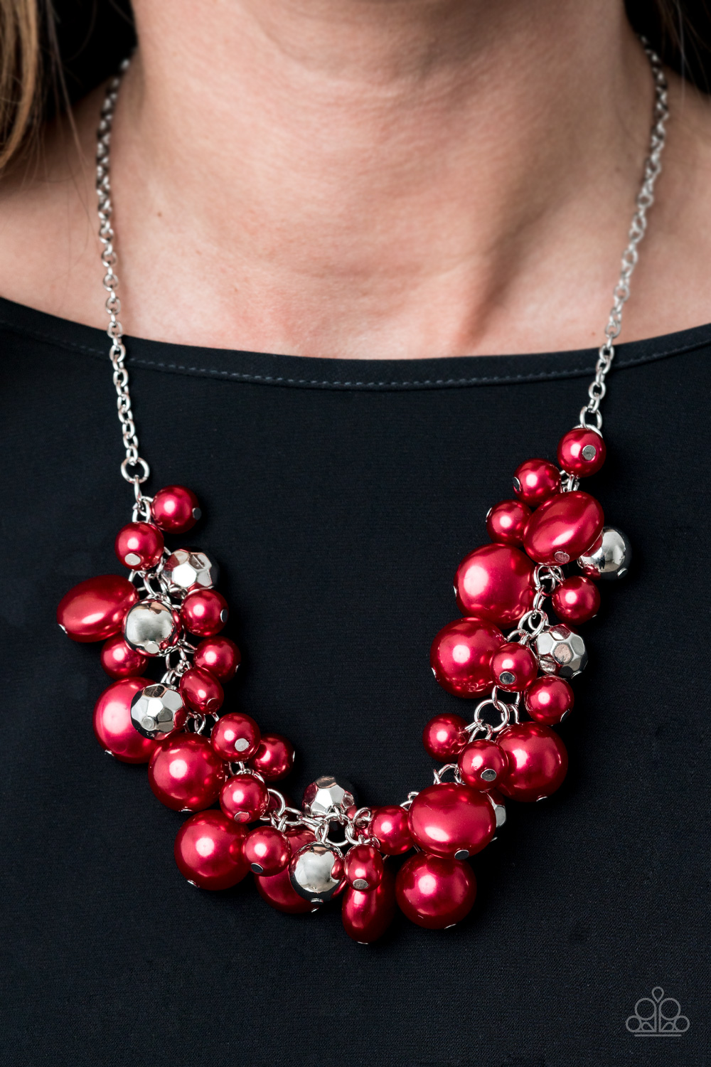 Sprinkled with faceted and shiny silver beaded accents, a bubbly collection of round, oval, and flat red pearls cluster below the collar for a statement-making finish. Features an adjustable clasp closure.