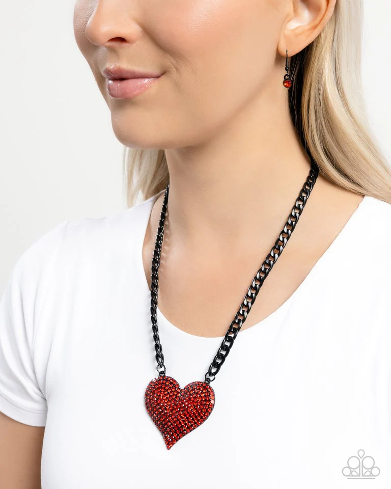 A dramatically oversized black heart frame is encrusted in row after row of dazzling red rhinestones from a black-painted curb chain, resulting in a