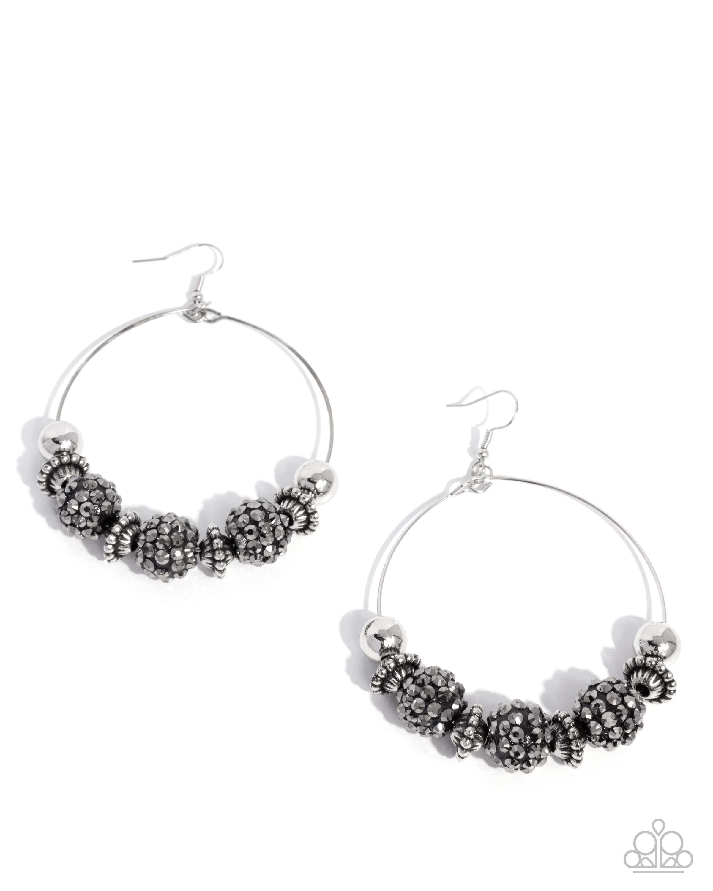 A stunning array of studded silver accents, oversized silver beads, and hematite rhinestone encrusted black beads are threaded along a dainty silver wire hoop, resulting in a dazzling pop of color. Earring attaches to a standard fishhook fitting.
