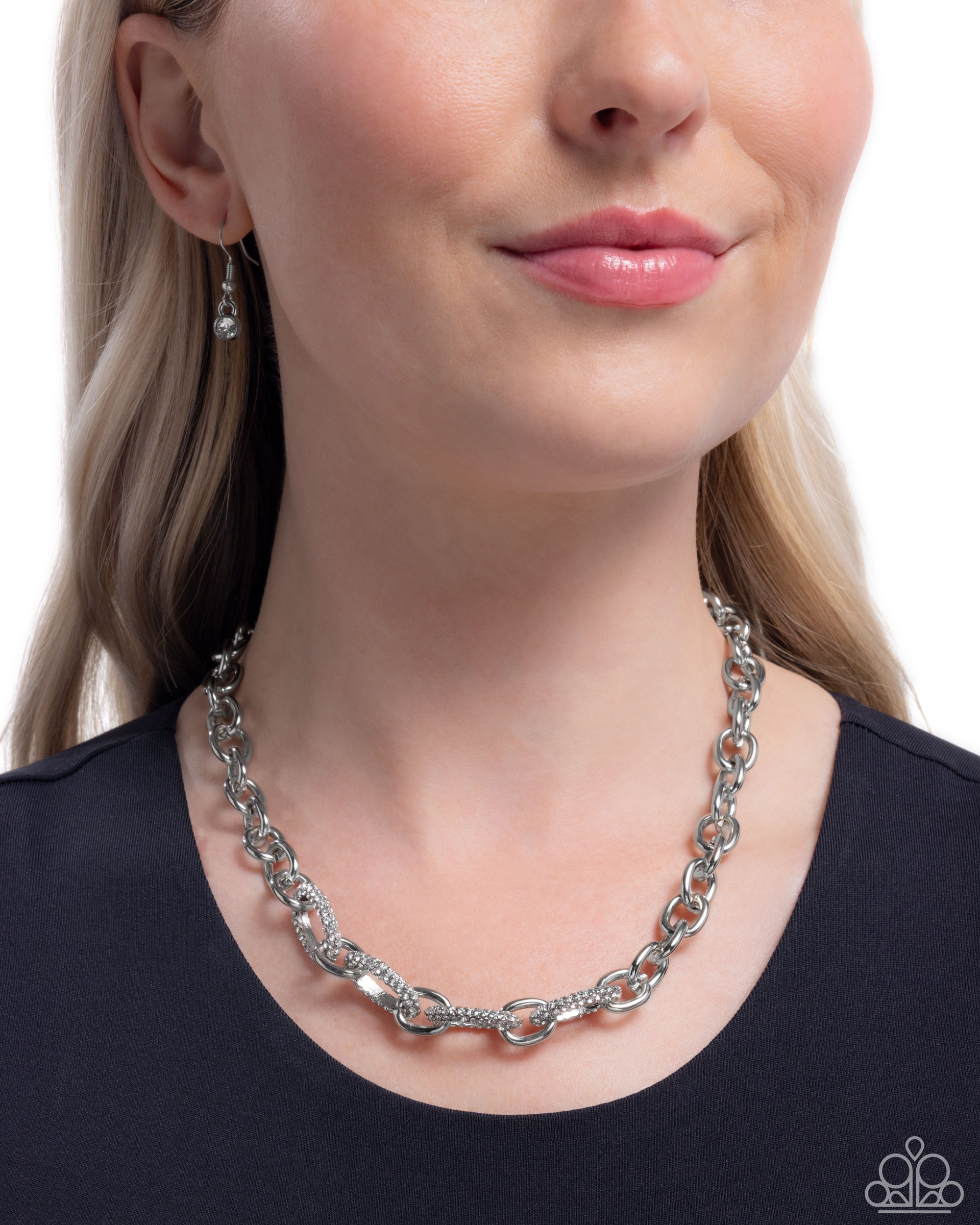 A chunky silver chain features oversized links, with a quartet of links encrusted in white rhinestones for a sparkling finish. The bold design adds a luxurious and elegant touch to any look. Features an adjustable clasp closure.
