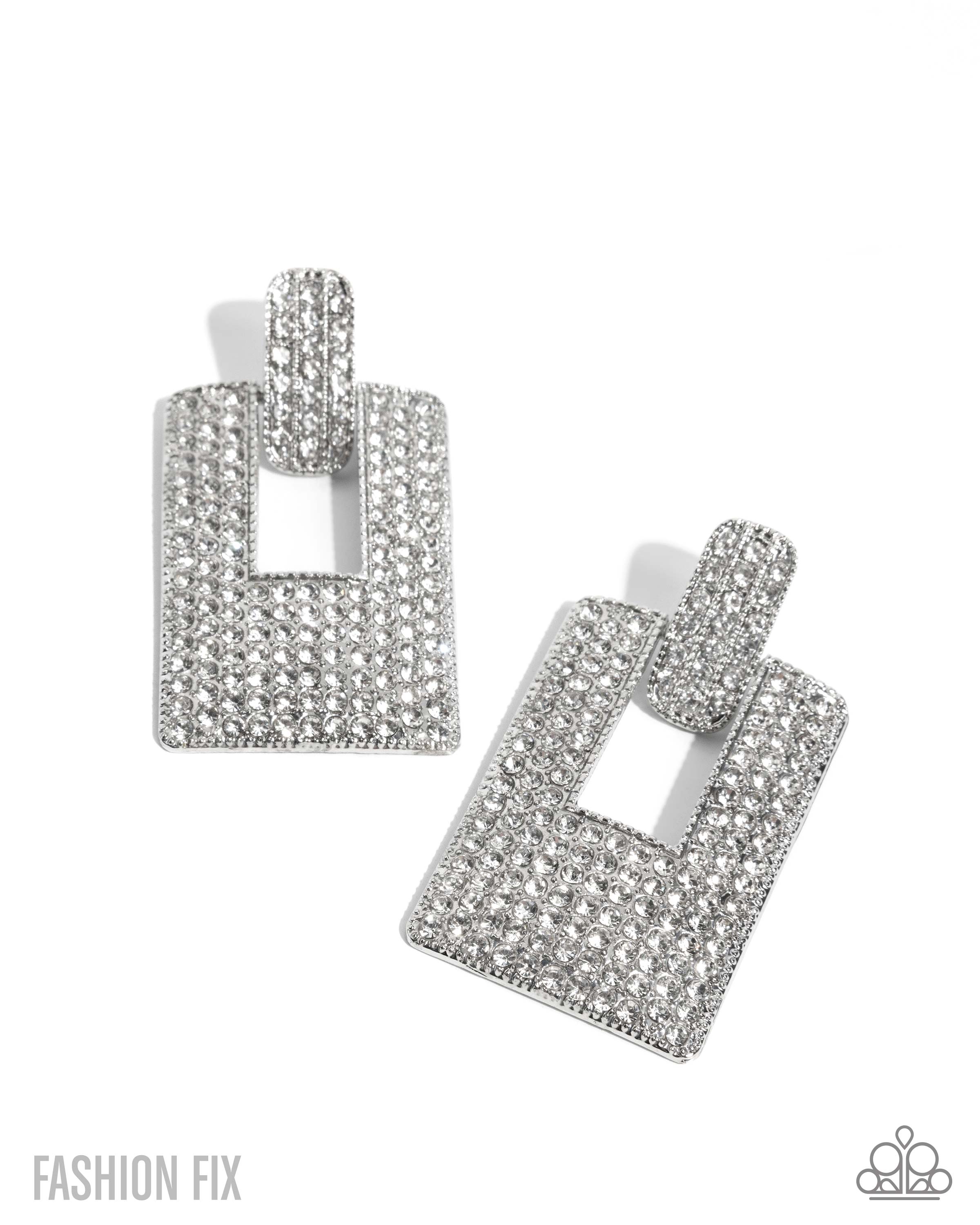 Emanating from an oval clasp, three dazzling rows of white rhinestones help guide the eye to an elongated, swaying, silver square embellished head-to-toe in dainty rhinestone sparkle for an adorably assertive lure. Earring attaches to a standard post fitting.