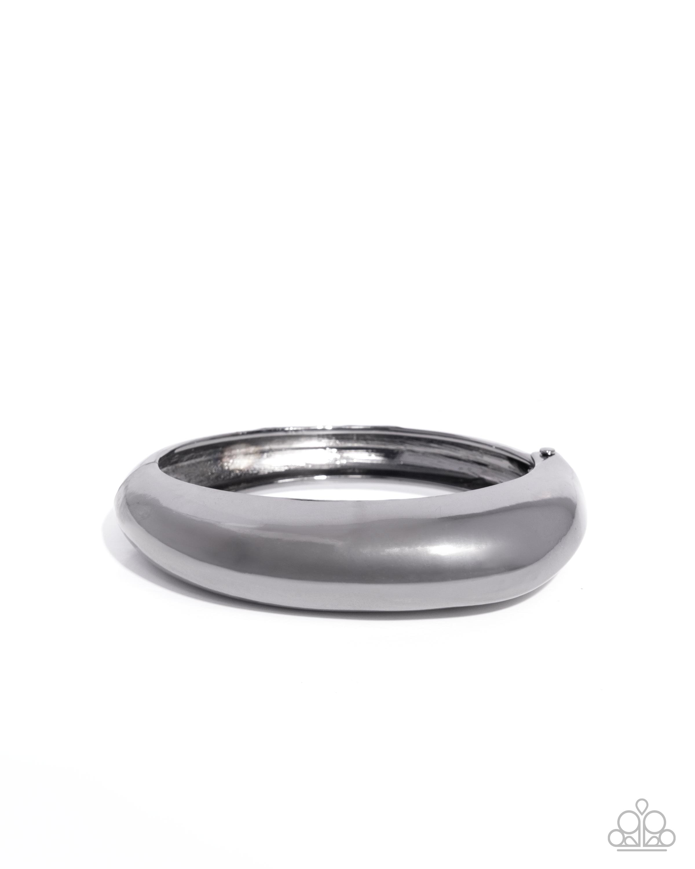 Featuring a highly reflective sheen, a thick gunmetal rounded bangle curls along the wrist, creating an unapologetically unique look. Features a hinged closure.