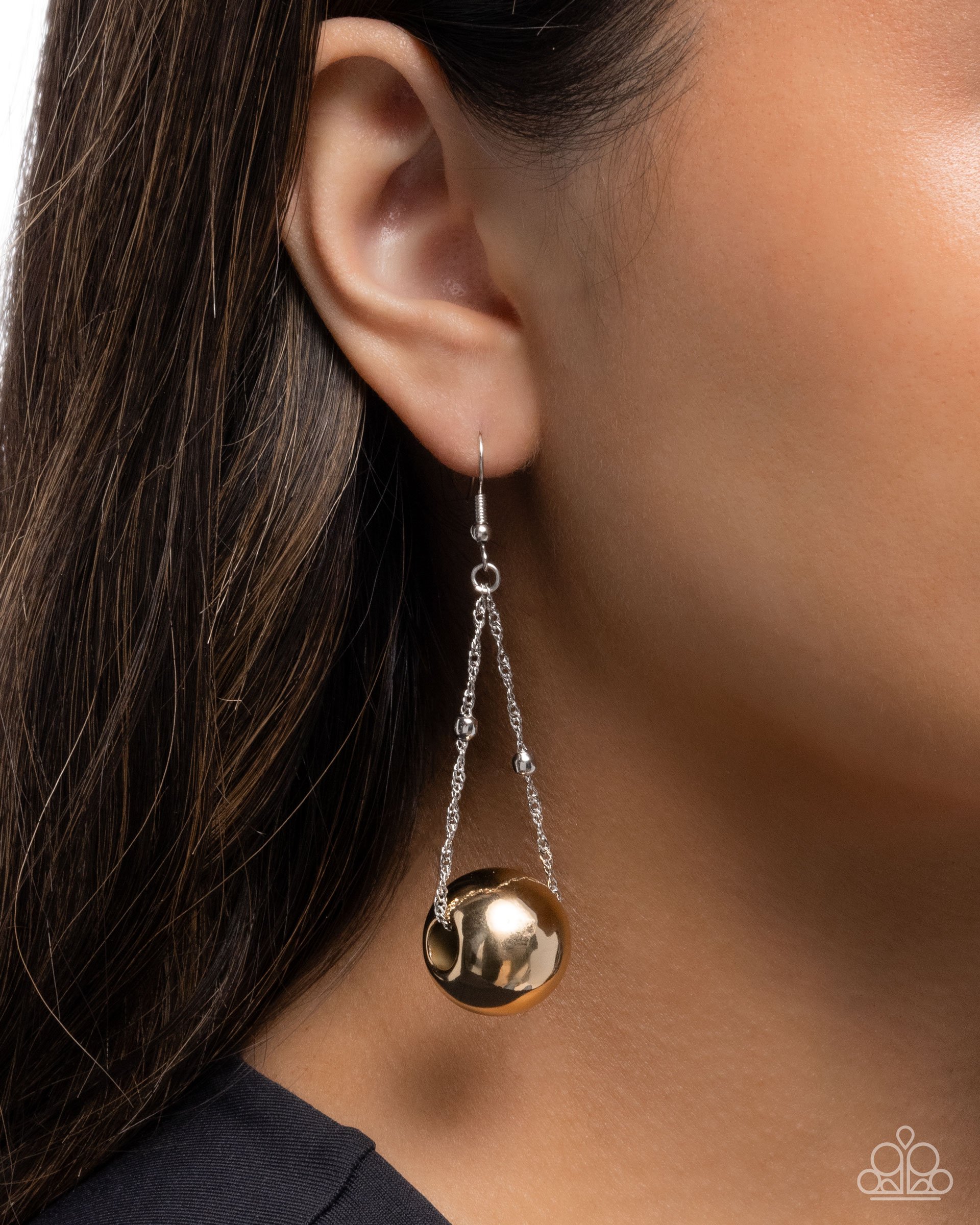 Infused along a dainty silver satellite singapore chain, an oversized gold ornament sways below the ear for an edgy eye-catching lure. Earring attaches to a standard fishhook fitting.