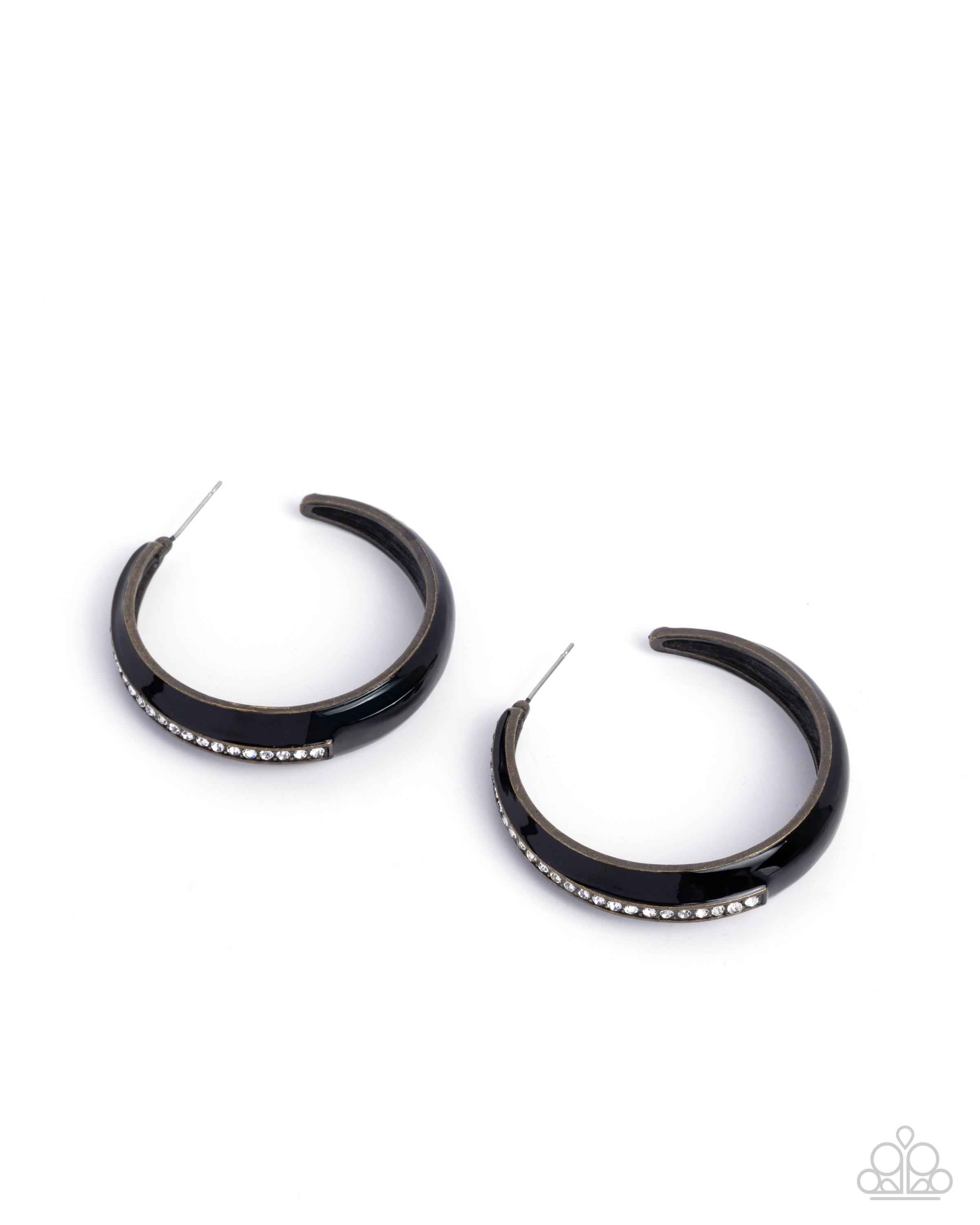 Featuring a line of white rhinestones, a sleek black-painted brass hoop coalesces and curls below the ear into a colorfully chic display. Earring attaches to a standard post fitting. Hoop measures approximately 1 1/2" in diameter.