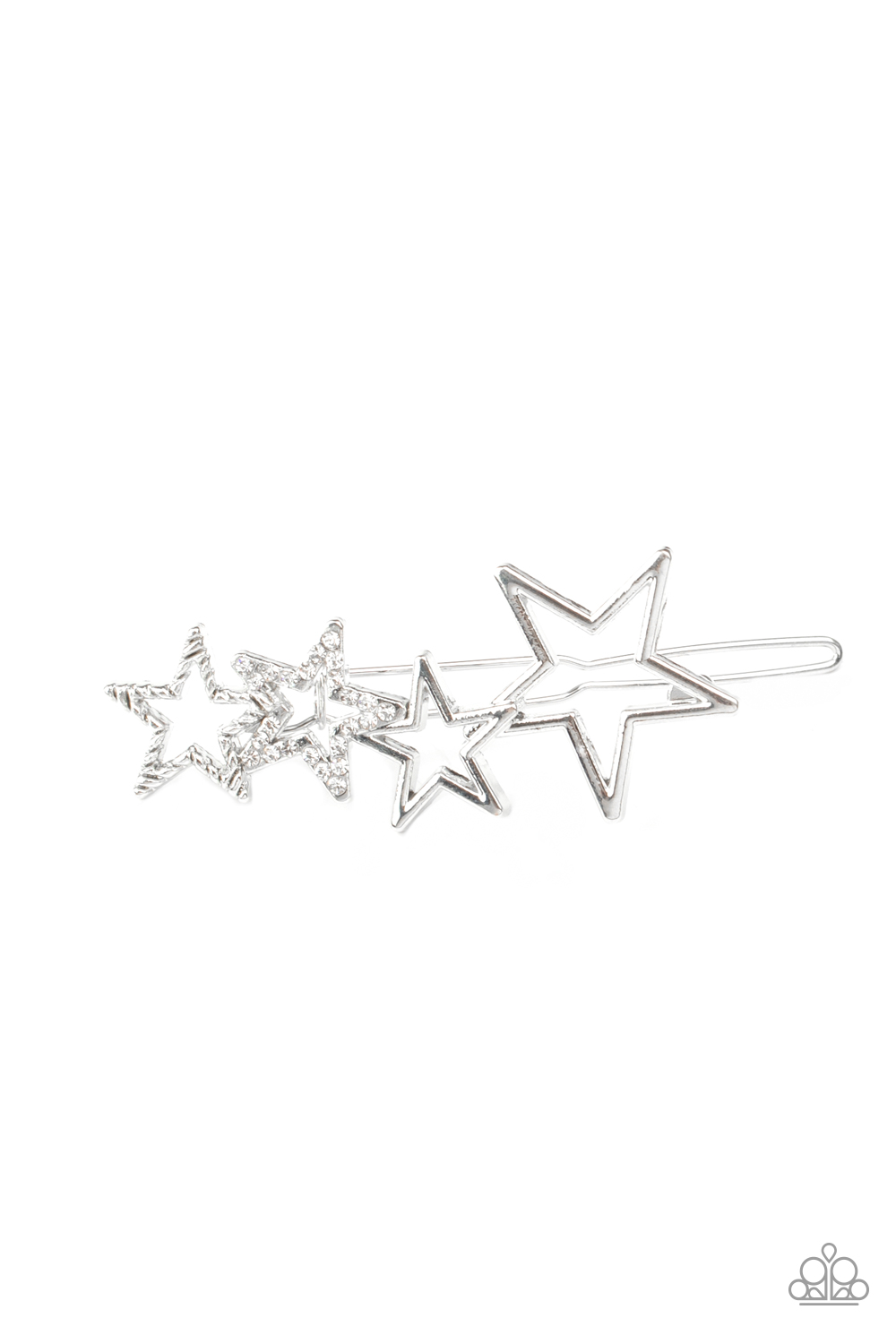 Featuring shiny, textured, and white rhinestone encrusted finishes, a collection of silver stars coalesce into a stellar frame. Features a clamp barrette closure.
