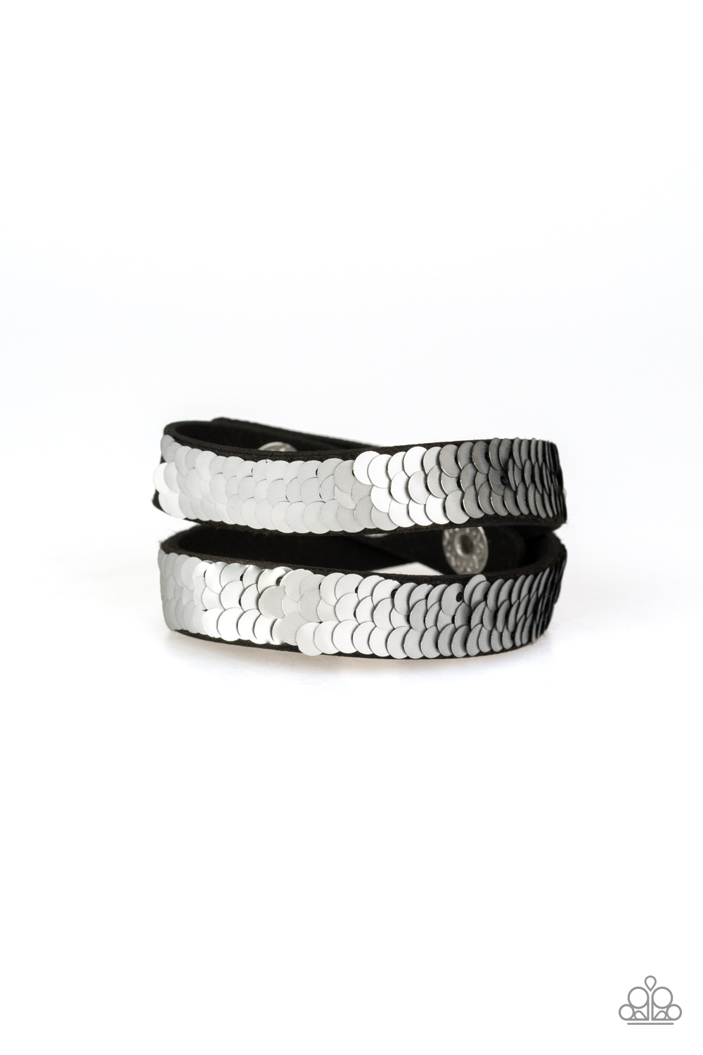 Row after row of shimmery sequins are stitched across the front of a lengthened black suede band. The elongated band allows for a trendy double wrap design. Bracelet features reversible sequins that change from silver to black. Features an adjustable snap closure.